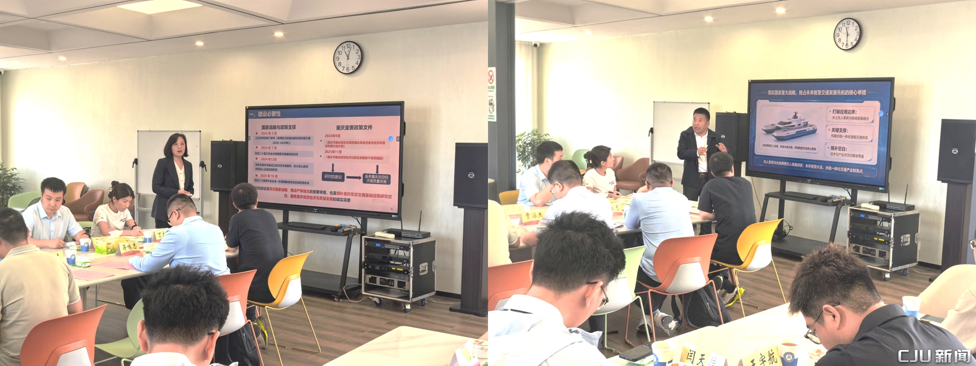 会上,两大融创院负责人分别汇报建设进展与交叉融合思路。低空交通融创院紧扣国家低空经济战略及重庆试点城市需求,以山地城市低空交通系统为特色,聚焦低空数字基础设施、低空气象感知、智能飞行控制、空域交通管控、低空运载器及新能源动力五大研究方向,已在多个领域取得标志性成果,致力于打造国内领先的科创、人才与产业策源平台。无人装备与人工智能融创院聚焦域环境具身智能与无人系统、多智能体协同与分布式决策、多模态认知与大模型智能三大研究方向,突破多项关键核心技术,其研发的“精海号”系列海洋智能无人艇广泛应用于南极及我国近海,实现成果工程化跨越。