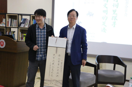 学生李明朴向梁波教授赠送自己亲笔写的书法作品。郭晓彤