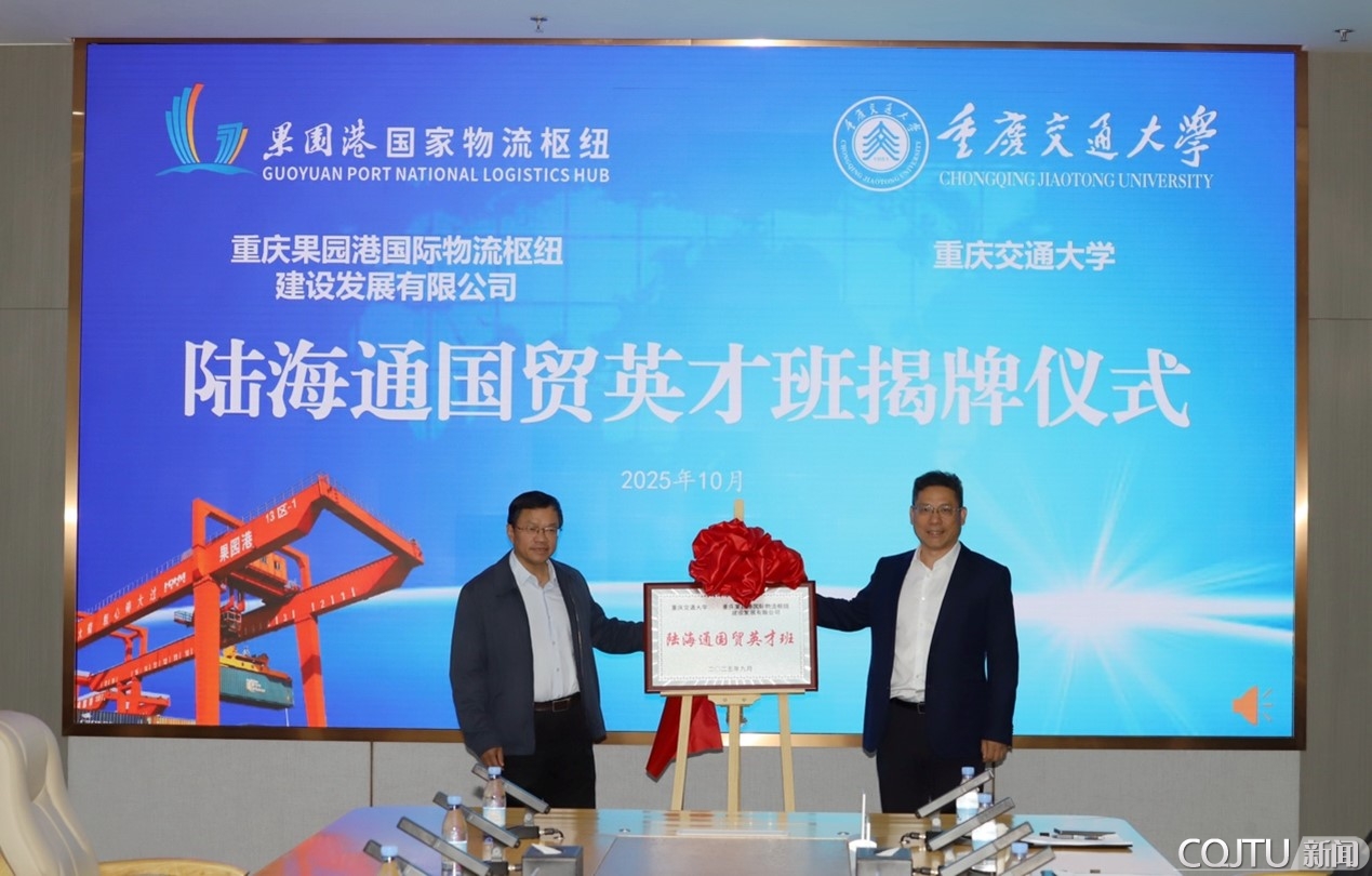 仪式现场气氛热烈,重庆保税港区集团领导梅时雨与重庆交通大学副校长罗均共同为“陆海通国贸英才班”揭牌。重庆交通大学副校长罗均在签约仪式上表示:“学校始终全面落实立德树人根本任务,致力于为学生搭建多元化实践教育平台,推进‘多元协同’育人模式改革。此次与果园港枢纽公司的合作,是双方优势互补、共谋发展的必然选择。学校将充分发挥自身在师资、学生培养和科研成果方面的优势,与果园港国家物流枢纽丰富的场景、鲜活的案例和国际化的标准深度融合,共同打造长江上游港航物流领域的产教融合标杆。”
