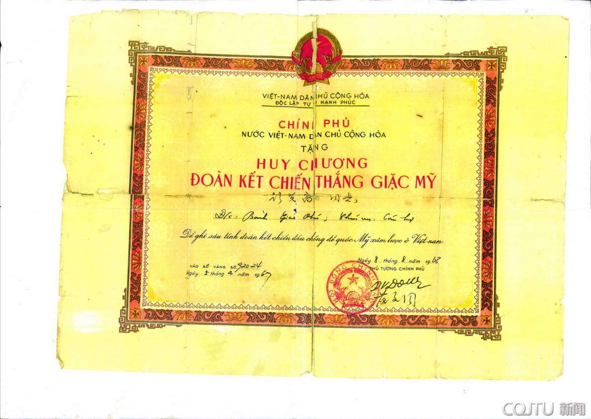 (档案馆馆藏1968年彭觉富援助越南公路建设 获颁时任越南总理范文同签署的嘉奖证书)