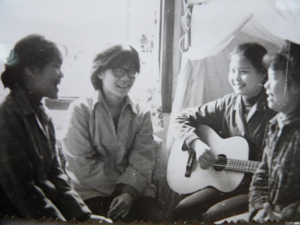 黄承锋(右)在寝室,桌上放着当时时髦的收录机