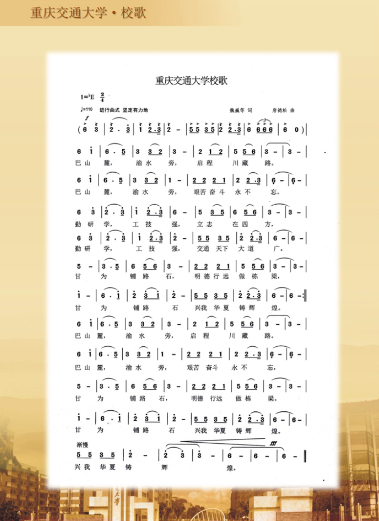 路,始自巴渝,通向天下;人,生于山水,化身基石。从《歌唱二郎山》到《重庆交通大学校歌》,词曲几经变迁,不变的是重庆交大人昂扬奋进的精神。只要校歌还在被庄严唱响,重庆交大就会永远把“明德行远”的刻度,刻在共和国的交通里程表上,也刻在每个交大人心里——那是最柔软的旋律,更是最坚定的信仰。它会时刻提醒每一位交大人,不忘“交通天下”的初心,在民族复兴的伟大征程中,不断谱写出无愧于历史、无愧于时代的崭新篇章!