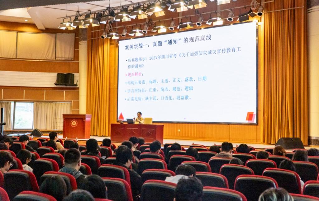 讲座围绕“核心命题:AI不是替代,而是赋能”“AI时代,规范是底线,思维是核心”“公文写作=思维训练+岗位胜任能力考核”三个主题展开,例举详实写作案例,讲解了AI时代对写作带来的便捷与并存的风险。