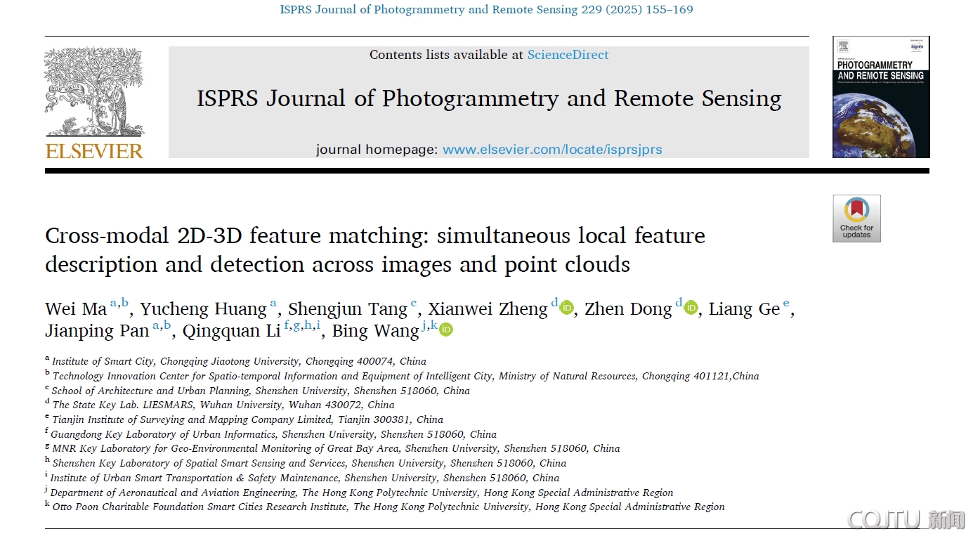 近日,重庆交通大学智慧城市学院智能感知与数字孪生团队在跨模态2D-3D特征匹配研究方面取得重要进展,相关成果《Cross-modal 2D-3D feature matching: simultaneous local feature description and detection across images and point clouds》发表于国际遥感与摄影测量领域顶级期刊《ISPRS Journal of Photogrammetry and Remote Sensing》(中科院一区,Top期刊,影响因子12.2)。该研究提出了一种新型联合特征描述与检测网络CMFM-Net,实现了图像与点云之间的高效、精准匹配,为智慧城市、自动驾驶、三维重建等领域的多源数据融合提供了关键技术支撑。智慧城市学院马威副教授为论文第一作者,硕士生黄昱程、潘建平教授为论文共同作者,香港理工大学王冰助理教授为通讯作者。