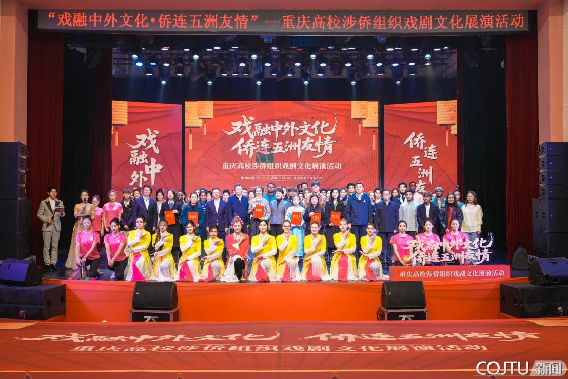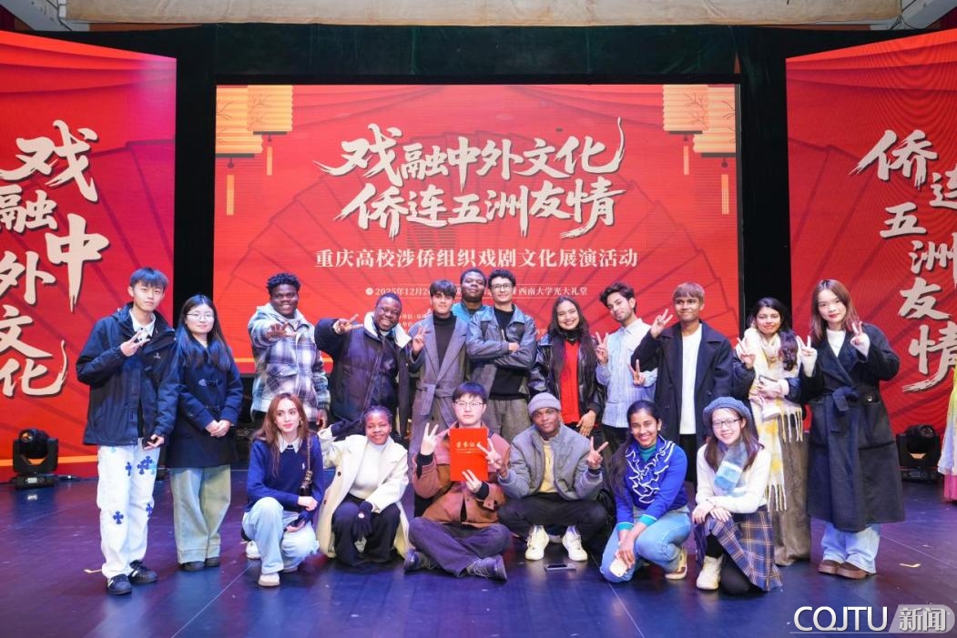 12月26日下午,以“戏融中外文化·侨连五洲友情”为主题的重庆高校涉侨组织戏剧文化展演活动在西南大学落下帷幕。重庆交通大学国际学生携原创短剧《光影与诗行》登台,以镜头里的光影为语、千年诗词为魂,在舞台上搭建起中外文化交流的桥梁,生动诠释了中华优秀传统文化的当代活力,也为构建侨界青年与海外青年的情感联结注入交大力量。