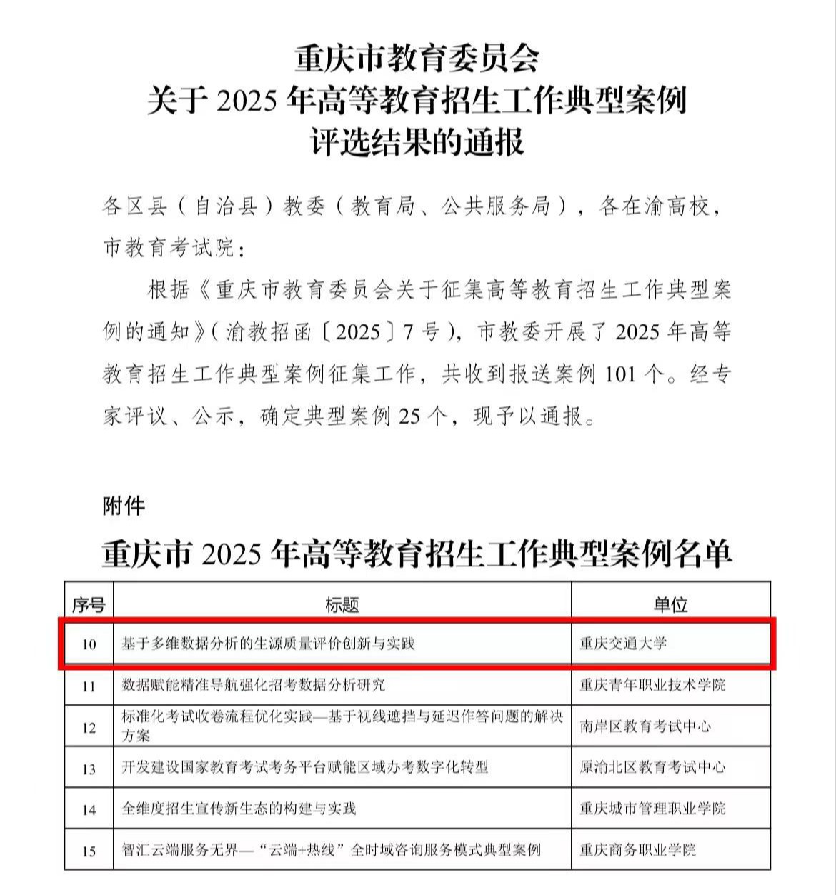 近日,重庆市教育委员会公布2025年高等教育招生工作典型案例评选结果,重庆交通大学报送的《基于多维数据分析的生源质量评价创新与实践》案例从全市101个征集案例中脱颖而出,获评全市25个典型案例之一。此次入选标志着我校在招生工作科学化、精细化改革方面取得重要成果,并获得上级主管部门的充分肯定。