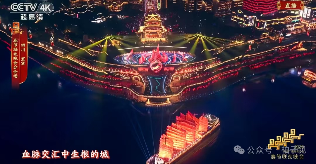 2月16日晚,中央广播电视总台2026年春节联欢晚会盛大启幕,四川宜宾分会场于长江干流“零公里”合江门精彩亮相。“万事皆宜,天下为宾”,长江首城邀四海同庆新春,三江之上金色帆船熠熠生辉,尽显巴蜀风韵与城市风采。这一场精彩亮相,离不开我校校友的专业担当与实干力量。