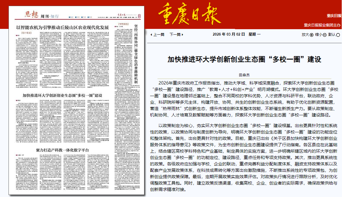 2026年重庆市政府工作报告指出,推动大学城、科学城深度融合,探索环大学创新创业生态圈“多校一圈”建设路径,推广“教育+人才+科创+产业”明月湖模式。环大学创新创业生态圈“多校一圈”建设是在地理邻近基础上,整合不同高校的学科优势、人才资源与科研平台,联动政府、企业、科研院所等多元主体,构建开放、协同、共生的创新创业生态系统,有助于优化创新资源配置,营造“热带雨林”式创新生态,提升市域创新体系整体效能,不断催生新质生产力。要从政策制定、机制协同、人才培育及数智赋能等方面着力,探索环大学创新创业生态圈“多校一圈”建设路径。