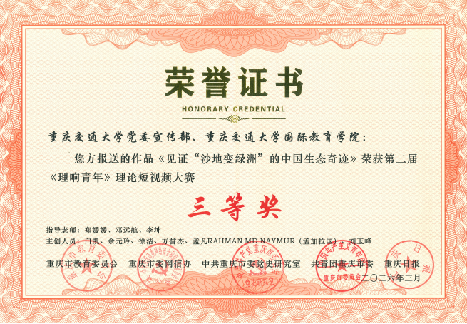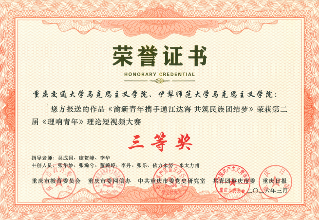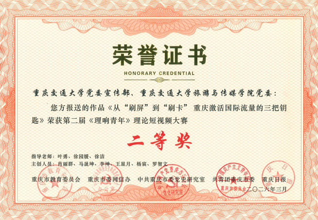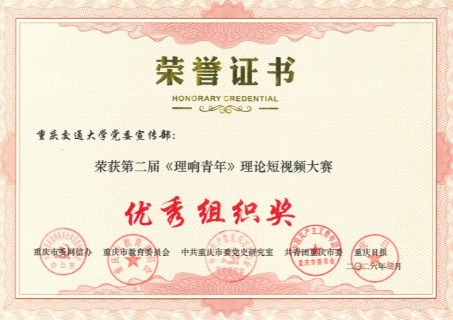 近日,重庆交通大学在第二届《理响青年》理论短视频大赛中再获佳绩,学校创作拍摄的理论宣讲视频《从“刷屏”到“刷卡” 重庆激活国际流量的三把钥匙》荣获二等奖,《见证“沙地变绿洲”的中国生态奇迹》《渝新青年携手通江达海 共筑民族团结梦》荣获三等奖,党委宣传部荣获优秀组织奖。