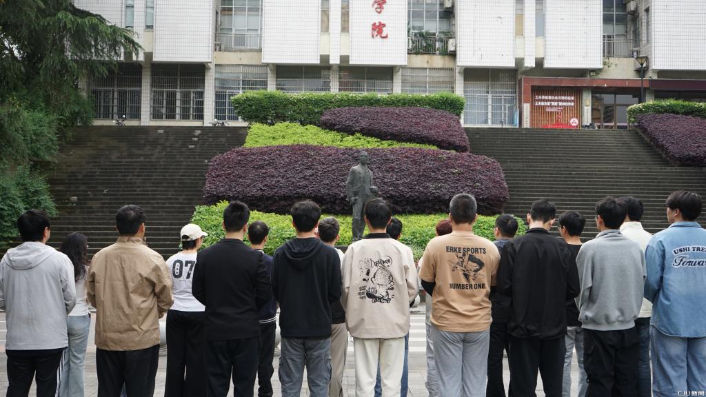 仪式现场庄严肃穆,全体师生列队肃立。教师代表依次向铜像敬献鲜花,鞠躬致敬。“茅以升班”学生手持白菊,缓步上前敬献鲜花,集体默哀,以最朴素而真挚的方式表达对科学巨匠的深切追思与崇高敬意。