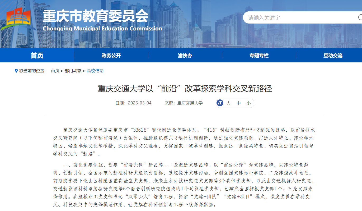 重庆交通大学聚焦服务重庆市“33618”现代制造业集群体系、“416”科技创新布局和交通强国战略,以前沿技术交叉研究院(以下简称前沿院)为载体,推进组织模式与运行机制创新,通过强化党建领航、打造人才特区、建设学术特区、培塑卓越文化等举措,深化学科交叉融合,支撑国家一流学科创建,探索出一条独具特色、切实促进前沿引领与学科交叉的“新路”。