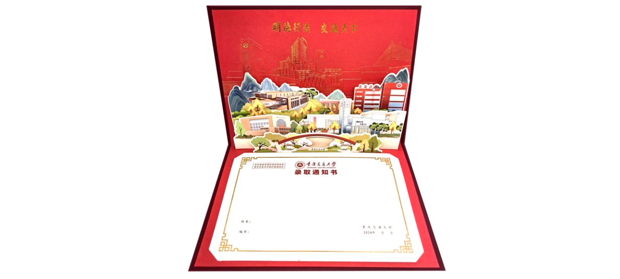 看今朝,校徽的精神传承,在校园各类场景中不断具象化。2019年,千余名交大学子以手语操献礼中华人民共和国成立70周年,队列变换间,校徽图案与“重庆交通大学”字样依次呈现,用整齐划一的姿态诠释着校徽承载的集体荣誉感。2021年建校70周年之际,校庆展台在“70”造型中心镶上校徽,让校徽成为校庆记忆的核心载体。2024年新版录取通知书采用激光雕刻、烫金工艺和手工拼插技术,烫金校徽、校名伴随光芒映射出金黄色,象征着学校发展道路金色辉煌,成为迎接新生的第一份文化印记。开学典礼上,新生身着印校徽的文化衫,在主席台上醒目校徽背景的映衬下庄严宣誓,开启青春征程;毕业典礼上,这枚徽章又与学位服相伴,见证学子“明德行远”的成长蜕变。