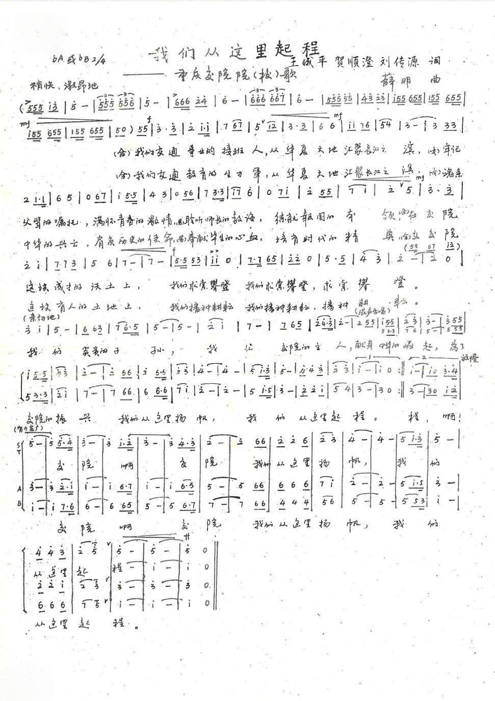 11月12日,校史故事刊载了《<从歌唱二郎山>到<重庆交通大学校歌>》一文后,宣传部收到了两路精神银发宣讲团团长邓家钦老师和副团长廖桂芳老师发的短信:“一直在关注学校校史365故事,每集必看,感融颇多!挺不错的。前几天看到365故事关于校歌的故事,我觉得有点问题。怎么从二郎山一下子就到了现在的新校歌?其间应该还有一首校歌。从80年代末到2020年左右(经查证为1980年代到2010年),有一首名为《我们从这里启程》的校歌,是每年新生进校歌咏比赛必唱的校歌,整整唱了约20多年。后面才是现在这首校歌。词作者为王成平、贺顺澄、刘传源,曲作者是河海学院退休老教授张智洪的妹夫,国家级作曲家薛明老先生(当时他女儿薛峰就读于我校水港系88级)。近日我都在寻找这首歌,现通过汽车系1988级学生回忆,找到了这首歌的录音,非常宝贵。现发给你惠存。”