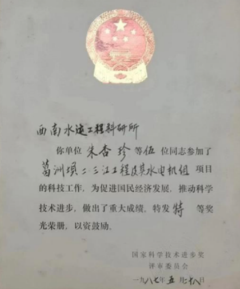 1981年1月4日19时53分,随着最后一车石料投下,葛洲坝大江截流顺利完成,千百年来桀骜不驯的长江,第一次按照人类的意愿改道而行。当万吨级船队鸣笛驶过船闸,当发电机组发出第一度电能,现场的建设者们欢呼雀跃。他们的付出,最终换来了沉甸甸的荣誉——国家科学技术进步奖特等奖。这枚奖章,凝结着朱杏珍、沈发蓉、杨学忠、刘炳炜、杜宗伟等专家的心血与汗水,更彰显了西科所人“顽强拼搏,甘当路石”的精神底色。