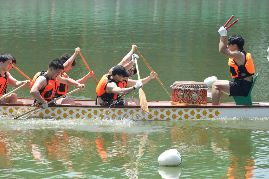李子湖的热闹,从不缺自然与人文的交融。2025年端午时节,澄澈湖面被龙舟赛的热闹场面点燃。鼓乐声自湖畔腾空而起,裹挟着夏风震彻云霄,当点睛的朱笔在龙头额间落下,朱砂红与龙舟的亮彩相映,瞬间唤醒了满湖的精气神。发令声响,十余艘龙舟如离弦之箭破浪而出,船桨整齐翻飞,溅起的水花似碎玉般撒落。岸边的欢呼瞬间翻涌得更烈,师生们挥舞着旗帜、高声呐喊,那滚烫的声浪与湖面上急促的鼓点共振,连环湖的香樟都似被感染,枝叶轻摇着为健儿们助威。