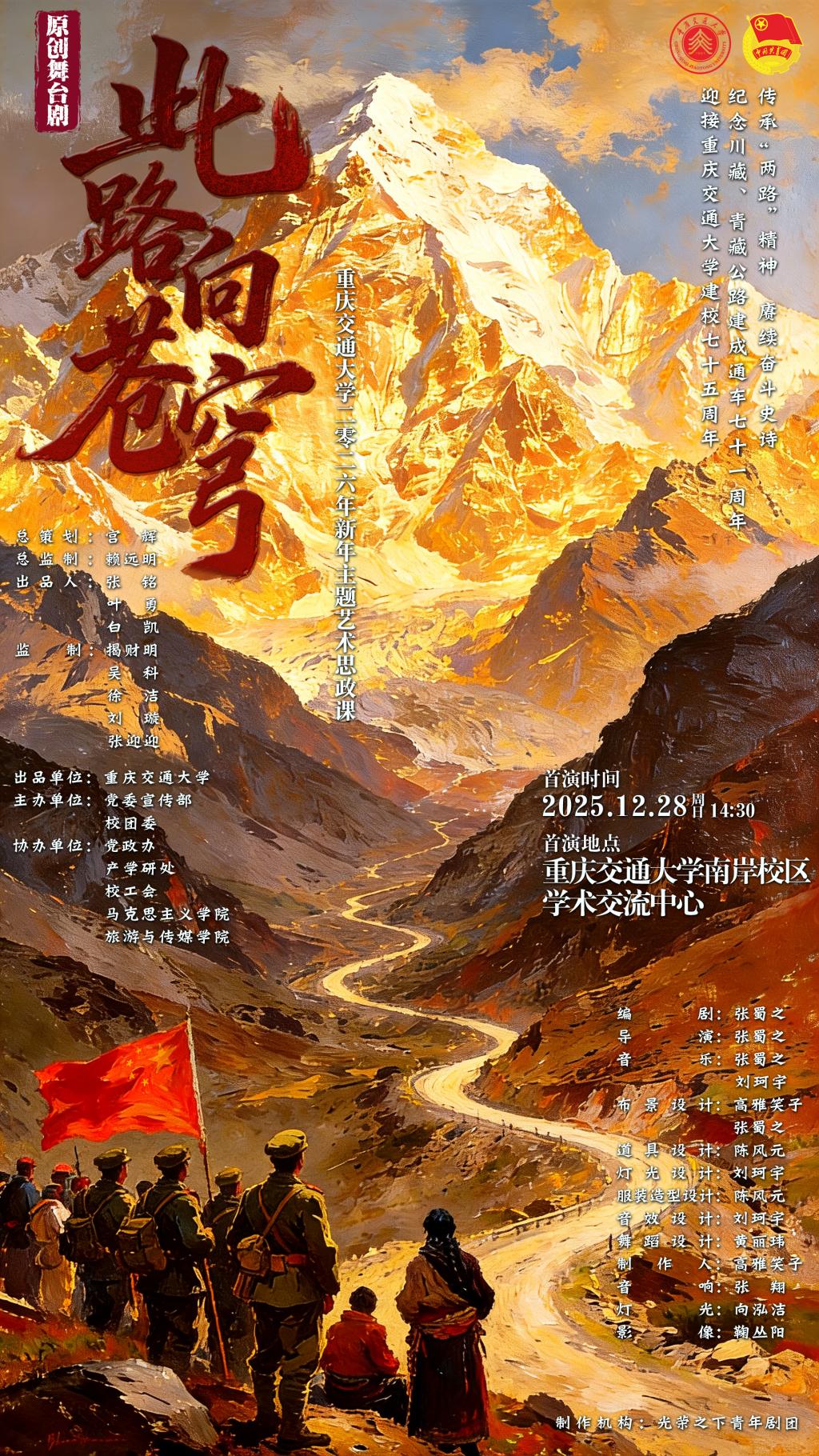 话剧《此路向苍穹》的诞生,根植于校史深处的血脉羁绊,更凝聚着创作团队一年半的心血与坚守。据校团委刘璇介绍,为还原真实的历史肌理,创作团队到四川、西藏的山川河谷实地踏勘,寻访年迈的亲历者,在沙哑的讲述中打捞散落在雪域高原的珍贵记忆;无数个日夜,他们将搜集的素材反复梳理、艺术化淬炼,历经专家指导研讨的点拨与八易其稿的反复淬炼,终于在历史真实与艺术张力之间,寻得了最动人的契合点。就连话剧海报,也凝聚着主创者的赤诚,他们在电脑前逐笔勾勒、逐色晕染,对每一处线条、每一抹色调反复斟酌、打磨修正,最终呈现出兼具历史厚重感与艺术感染力的视觉画卷,为这部承载着初心与信仰的精神史诗,提前埋下了最温柔的伏笔。
