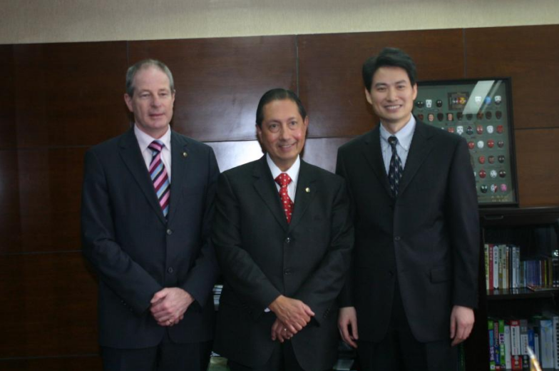 时任华杰公司总经理、党总支书记的张世文(右)在办公室会见时任FIDIC主席帕迪拉(中)