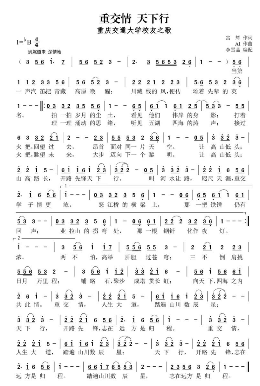 “重交情,人生大道,踏遍山川数辰星;天下行,开路先锋,志在远方是归程。”校党委书记宫辉创作的《重交情・天下行》旋律悠扬,穿越七十四载风雨岁月,道出了三十余万交大人的共同心声。那些在雪域高原战斗的先辈故事,那些逢山开路、遇水架桥的奋斗足迹,都在悠扬的曲调中缓缓铺展……它将交大人的初心与使命娓娓道来,也让无论走多远、飞多高的交大人,总能在熟悉的旋律中寻到心灵的港湾——母校是根,校友会是家,一声交大人,一生校友情。从嘉陵江畔的初创之地到科学城的现代化校园,从川藏公路的拓荒岁月到交通强国的建设征程,重庆交通大学校友会如一条坚韧的纽带,将遍布在全国各地的校友紧紧相连,在时光长河中编织出一段段感人至深的家国情怀与同窗佳话。