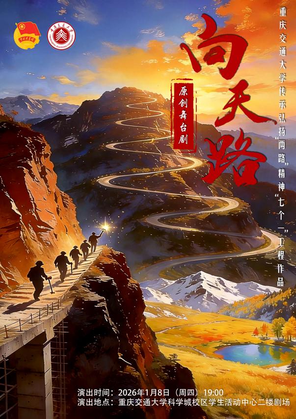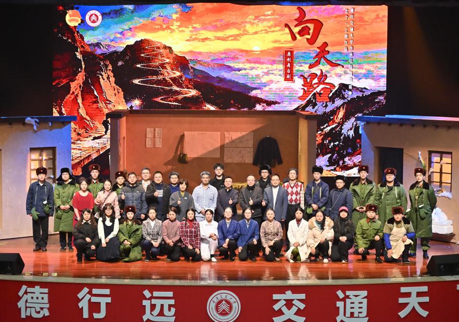 时光碾过岁月的纹路,将奋斗的足迹深深镌刻;校史漫过时光的长河,让精神的光芒代代相传。从川藏公路的险峰峻岭,到青藏公路的雪域高原,一代代交通建设者用脚步丈量山河,用坚守铸就天路。这份藏在校史深处的赤诚,融在血脉之中的担当,在新时代的重交校园里,化作了舞台上的光影流转,凝成了原创舞台剧《向天路》的深情演绎。它是交大人对校史精神的温柔回望,是对老一辈交通先行者的崇高致敬,更是学校以美育铸魂、以文化育人的生动实践。从校史星河中撷取奋斗星光,以舞台为纸、真情为墨、青春为声,将高原筑路的峥嵘岁月娓娓道来,让那段不畏艰险、矢志报国的时光,在光影里重生,在演绎中永恒,成为重交校史中一抹温润而坚定的亮色......