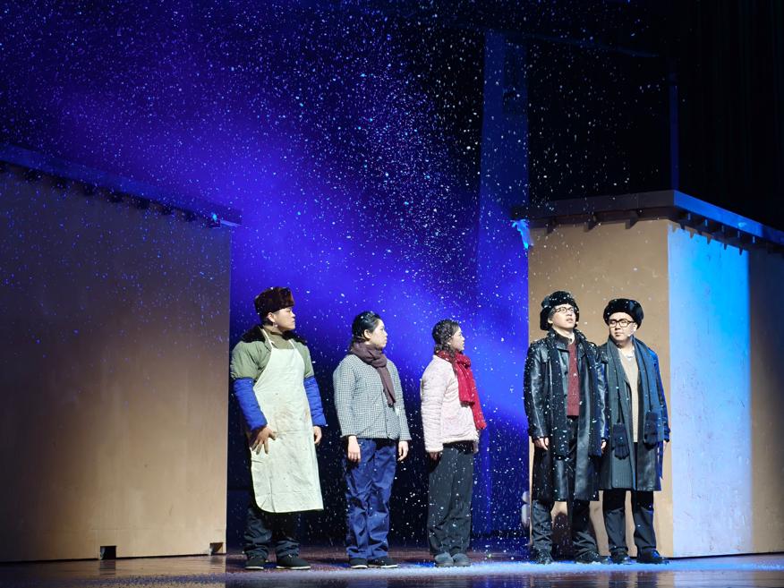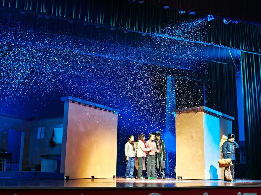 作为凝聚全校师生心血的匠心之作,《向天路》的舞台呈现独具巧思,成为学校艺术创作的一大亮点。剧目采用“医院病榻追忆”与“昆仑山奋斗历程”双线交织的叙事结构,将个人人生选择与国家发展使命紧密相连,让观众在时空交错中沉浸式感受老一辈交通人的家国情怀。舞台之上,巧思设计的旋转房屋布景更是点睛之笔,道具每转动一面,便自然切换一个特定场景,从昆仑山风雪交加的科研据点,到医院温暖静谧的病榻,从高原简陋的宿舍到充满烟火气的家庭,布景旋转与剧情推进浑然一体。搭配精心设计的灯光与舞美,清冷凛冽勾勒高原的苍茫,温暖柔和晕染生活的温情,光影流转间,让观众仿佛身临其境。而演员们真挚动人的表演,更让角色鲜活立体,他们用颤抖的声音诉说艰辛,用坚毅的眼神传递力量,用朴实的动作诠释奋斗,每一个表情、每一段情节,都饱含真情、直击人心。