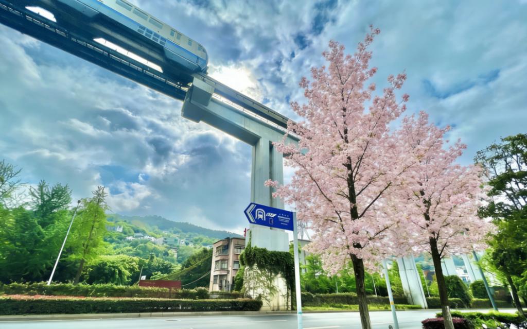 最独特的,莫过于交大独有的赛博与古典交织之美。轻轨3号线交大站凌空而立,银灰色的列车穿梭在繁花与绿意之间,金属的冷冽科技感,与花团簇拥的古典雅致奇妙碰撞,构成独一无二、别处难寻的校园景致。列车缓缓驶过,像一条银色的光带,掠过紫藤花瀑、玉兰枝头、三角梅影,现代都市的节奏与自然诗意的静谧在此完美融合。学子们从轻轨站走出,一步踏入繁花似锦的校园,便从喧嚣的都市烟火,走进宁静的书香天地。课堂之上,他们潜心求知,汲取知识的力量;课间之余,抬眼便是繁花满目,让心灵在自然之美中得到治愈与滋养。