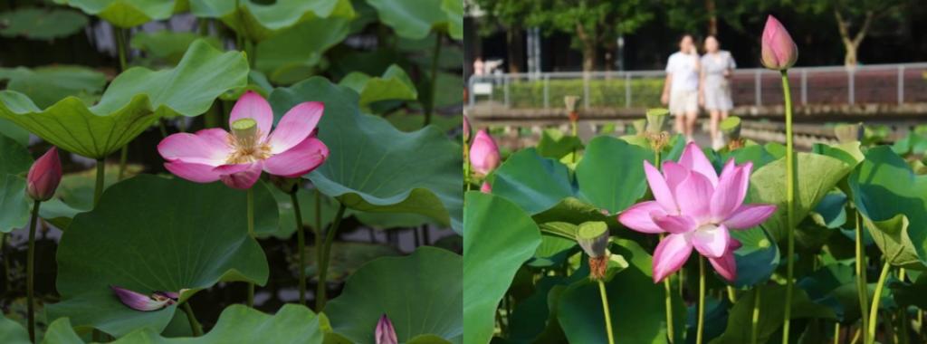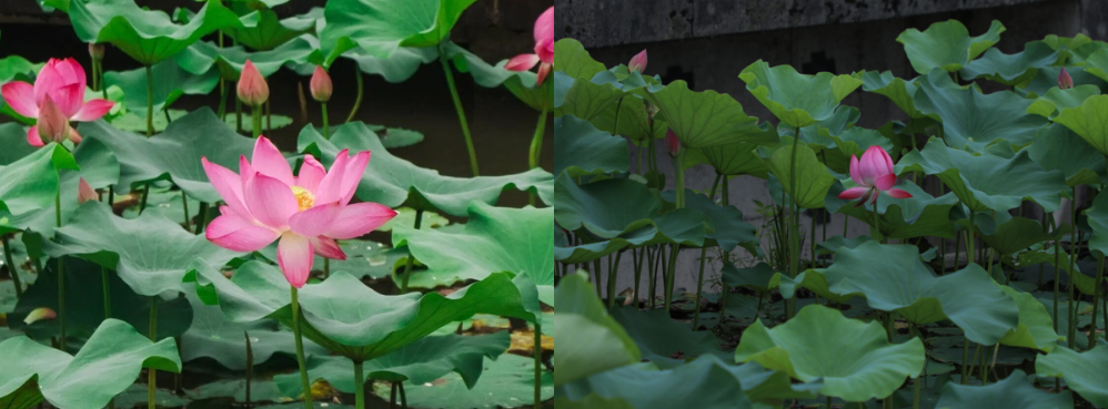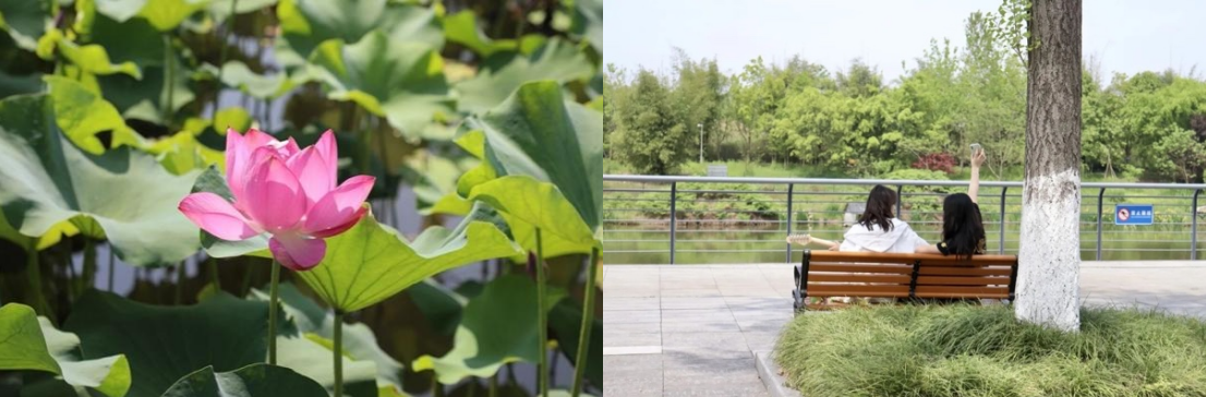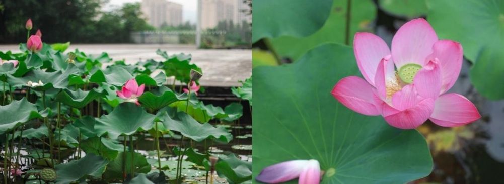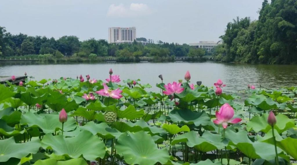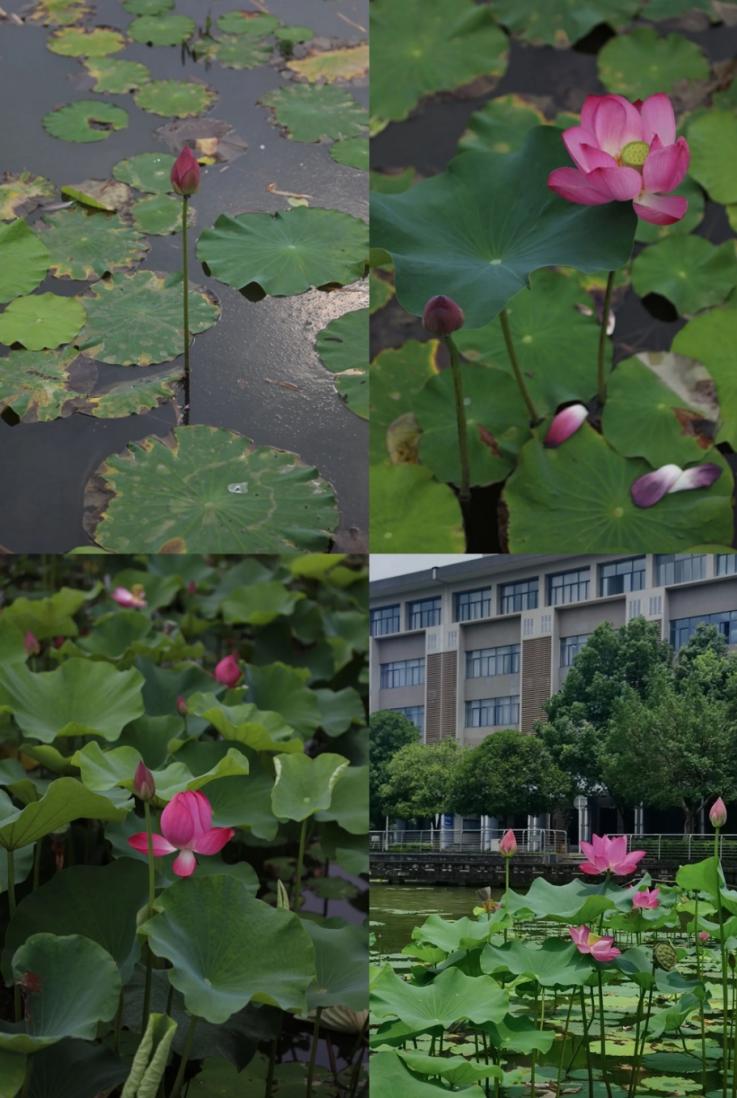 莲韵幽幽,花影柔润,荷花与荷叶在晨光晚风里,晕染出《荷塘月色》般的清雅意境;驻足桥上或湖岸小坐,静观一池荷风,心境澄澈、浮躁尽散。“凌波仙子镜中芳,也带酣红学醉装”,荷花临水而立、婉约清雅;李子湖畔绿竹绰约,斜风细雨中莲叶田田、荷香袅袅,正是“风含翠篠娟娟净,雨裛红蕖冉冉香”的绝美写照;远望芙蓉亭亭玉立,更彰显“出淤泥而不染,濯清涟而不妖”的高洁品格。盛夏时节,荷叶层层叠叠铺满水面,绿意浓得化不开,阳光洒落,露珠如星辰般晶莹,滚动闪烁,像散落人间的星辰;粉白荷花从绿叶间亭亭探出,含苞者低头含语,半开者温婉含蓄,盛放者清雅脱俗,姿态优雅,风骨清绝,把杨万里“接天莲叶无穷碧,映日荷花别样红”的江南荷景,在山城交大完美呈现。