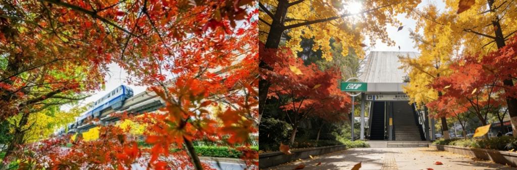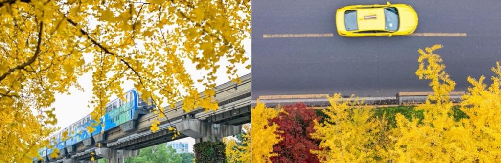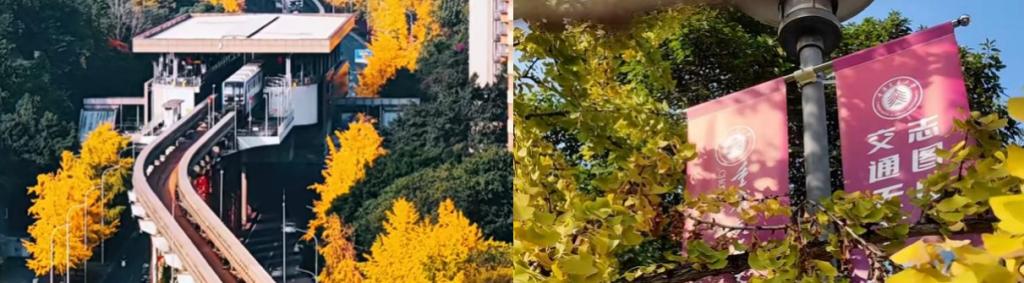 轻轨3号线重庆交通大学站凌空而立,简洁大气的站台焕然一新、明亮白净,银灰色列车平稳穿行在艳红枫叶与金黄银杏之间。现代都市与秋日盛景奇妙碰撞、完美融合,构成别处难寻的独特景致。列车缓缓驶过,与漫天金叶、巍巍钟楼、书香校园相映成趣,既有山城立体的现代感,又有自然秋景的治愈力,一动一静、一刚一柔,让交大的秋,多了几分无可替代的魅力。