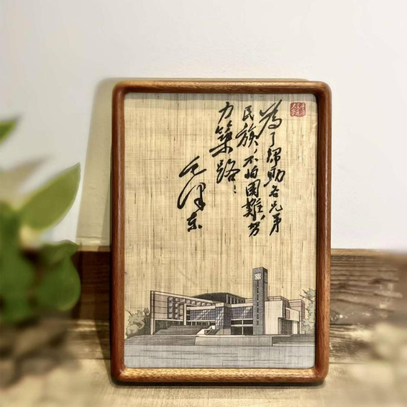 文创团队始终相信,校园文化只有与深厚的中华文脉相连,才能迸发更持久的生命力。在“墨韵交大”系列中,他们做了一次大胆的跨界尝试——荣昌夏布画框。在国家级非遗“荣昌夏布”那天然质朴的肌理之上,手绘出校门、红楼、水塔、桥梁与三峡大坝。设计师数次往返于校区建筑与设计台前,不依赖照片,只靠肉眼和尺规记录比例线条,只为在方寸之间实现图案的“一比一”神韵还原。这不仅是对校园风貌的描摹,更是让地域非遗工艺与交大硬核的学科符号,完成了一次跨越时空的对话。用最柔软的织物,承载起最厚重的校史。
